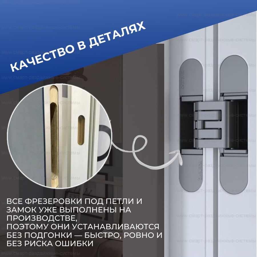 Скрытые петли позволяют точную регулировку дверного полотна в трёх плоскостях, что облегчает установку и делает её предсказуемой как для профессиональных монтажников, так и для самостоятельных мастеров. Цельноалюминиевый короб без МДФ и дерева сохраняет стабильную геометрию, не реагирует на влажность и температуру, исключая деформацию и усадку со временем.