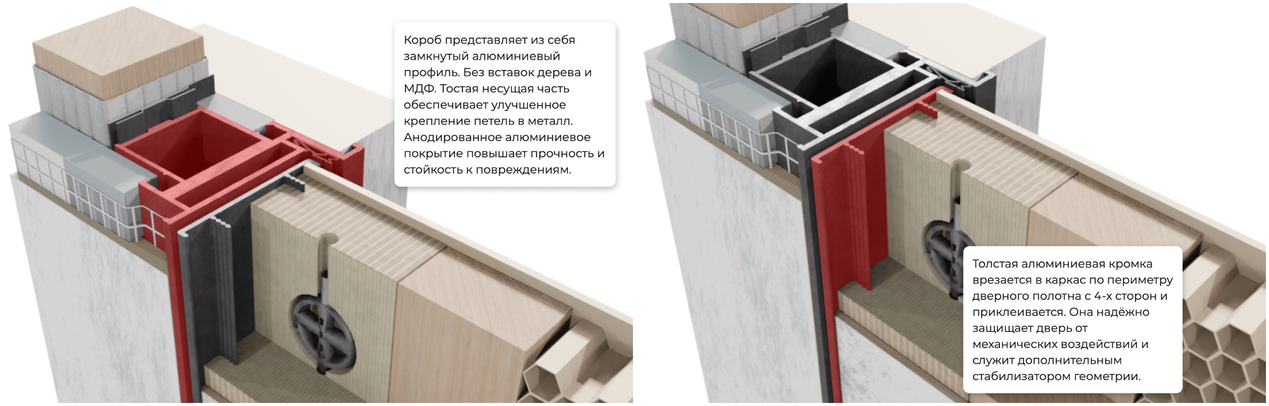 Короб полностью алюминиевый, без МДФ и дерева, что исключает усадку, деформацию и разбухание при изменениях влажности и температуры. Высокие двери оснащены стабилизатором, предотвращающим прогиб и изгиб полотна. Петли Armadillo 7000 обеспечивают плавное и бесшумное открывание, а трёхточечная регулировка позволяет точно выставить полотно в трёх плоскостях. Уплотнитель DEVENTER (Германия) гарантирует плотное примыкание двери и повышает шумоизоляцию.