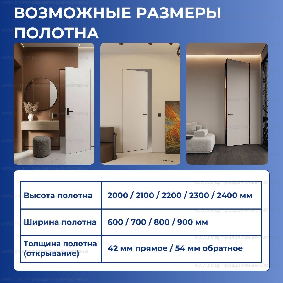 Полотно поставляется в аккуратной белой грунтовке, полностью готовой под финишную покраску. Поверхность ровная и не требует дополнительной подготовки, что экономит время на отделке. Дверь можно покрасить в цвет стены для полного «скрытого» эффекта или выделить контрастом. Полотно доступно в стандартных размерах 600, 700, 800 и 900 мм по ширине и 2000, 2100, 2300 и 2400 мм по высоте, что позволяет адаптировать решение под любой проект. Также возможно изготовление нестандартных размеров под заказ до 3000 мм.