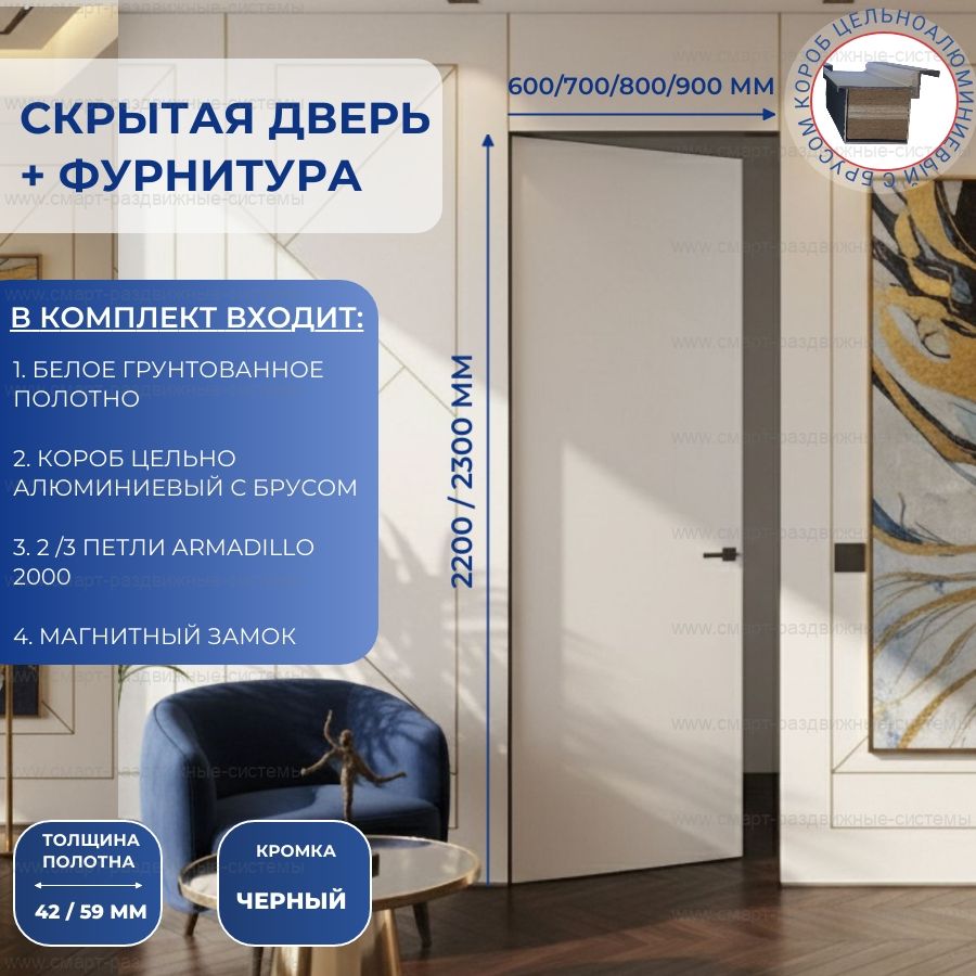 Белое грунтованное полотно с кромкой черной кромкой - 1 шт: Высотой 2000 /2100 мм, шириной 600/700/800/900 мм, толщиной 42 мм наружного открывания и 59 мм внутреннего открывания. Полотно подготовлено под декорирование или покраску, что позволяет легко адаптировать его под ваш интерьер. Черная кромка на скрытой двери создаёт визуальный акцент, который подчёркивает геометрию дверного проёма и делает интерьер более выразительным и современным. Она добавляет глубину и контраст в пространство, структурирует линии стен.