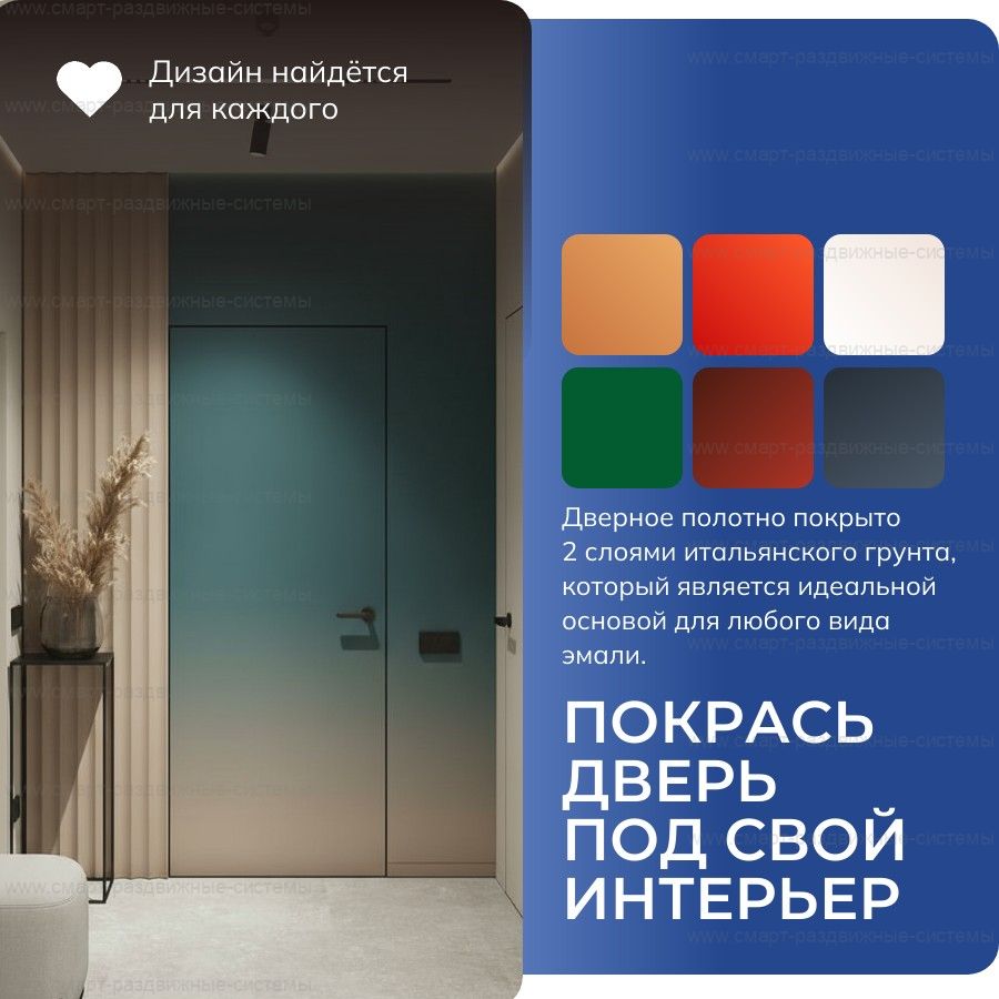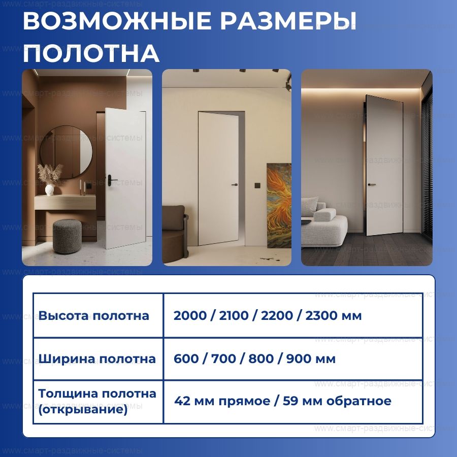 Полотно поставляется в аккуратной белой грунтовке, полностью готовой под финишную покраску. Поверхность ровная и не требует дополнительной подготовки, что экономит время на отделке. Дверь можно покрасить в цвет стены для полного «скрытого» эффекта или выделить контрастом. Полотно доступно в стандартных размерах 600, 700, 800 и 900 мм по ширине и 2000, 2100 и 2300 мм по высоте, что позволяет адаптировать решение под любой проект.